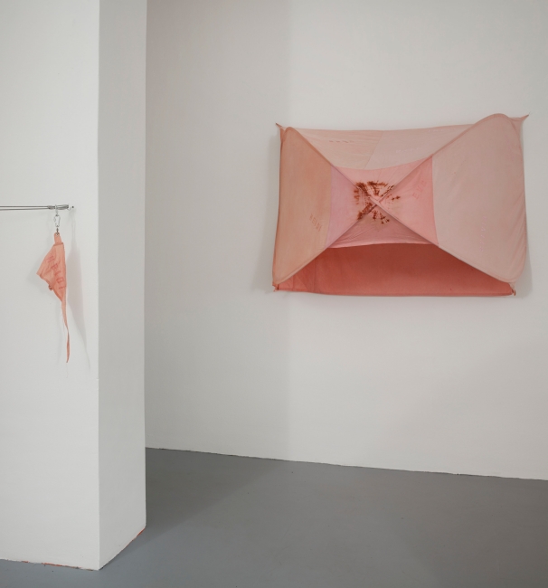 Blaue oder rote Karos sind dem Design von traditionellen Küchenhandtüchern entliehen. Großflächige Flecken suggerieren Gebrauchsspuren oder Verschmutzungen. Gelbliche oder bräunliche Einfärbungen lassen an Körperflüssigkeiten denken.